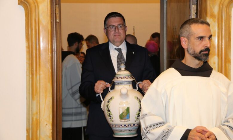 Nel corso della celebrazione, Santangelo ha consegnato al Custode della Basilica l’anfora con il logo della Regione, simbolo dell’offerta dell’olio per la lampada votiva che arde sulla tomba del Santo. Ha inoltre portato l’immagine della loggetta che sarà oggetto di restauro grazie al sostegno della Regione Abruzzo.