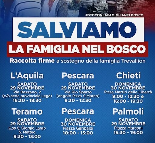 Abruzzo. Sabato 29 e domenica 30 novembre la Lega Abruzzo sarà presente nelle principali piazze della regione per raccogliere firme a sostegno della famiglia di Palmoli, affinché i tre bambini allontanati possano tornare a vivere con i propri genitori. I gazebo saranno allestiti a Palmoli e nei quattro capoluoghi di provincia.