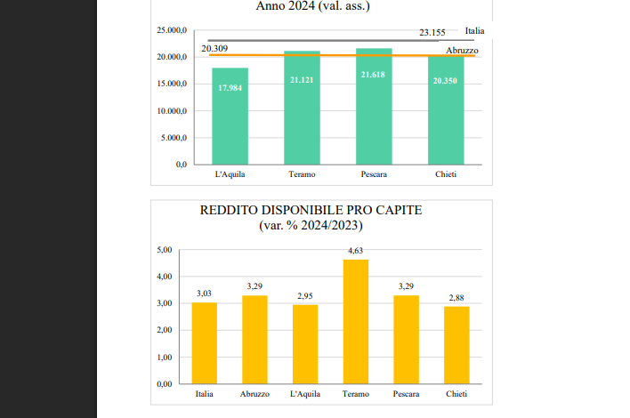 Secondo quanto emerge dall’analisi del CRESA – Centro Studi dell’Agenzia per lo Sviluppo della Camera di Commercio del Gran Sasso d’Italia nel 2024 il reddito disponibile delle famiglie abruzzesi registra un aumento su base annua (+3,43%) maggiore del resto del Paese (+2,98%) e anche singolarmente presi del Mezzogiorno (3,38%), del Centro (+2,95%) e del Nord (+2,80%). Particolarmente brillante la performance di Teramo che, con un aumento del 4,80% si colloca al quinto posto della classifica delle province italiane preceduta da Rimini, Ragusa, Venezia e Benevento. Molto più giù nella graduatoria, con incrementi inferiori alla media abruzzese e meridionale, figurano Pescara (52° con +3,09%), L’Aquila (60°, +2,75%) e Chieti (62°, +2,59%).