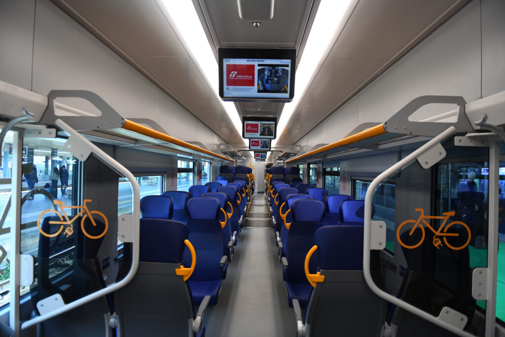 Trasporto biciclette – A bordo treno sono disponibili 20 postazioni per le biciclette con prese elettriche incluse, che consentono di ricaricare i modelli di nuova generazione, per dare ai viaggiatori la libertà di scegliere una mobilità integrata e a basso impatto ambientale.