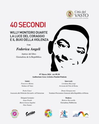 “La figura di Willy Monteiro Duarte – dichiara il sindaco di Vasto, Francesco Menna – rappresenta per tutti noi un simbolo di coraggio civile, di rispetto e di difesa dei valori fondamentali della convivenza. Con questa iniziativa i nostri giovani potranno vivere un momento di riflessione profonda sul valore della vita e dell’amicizia. Come Amministrazione comunale crediamo fortemente nel ruolo dell’educazione come strumento per contrastare ogni forma di violenza, bullismo e indifferenza. Parlare di Willy significa parlare di rispetto e responsabilità e per questo non deve essere dimenticato. Ringrazio tutti coloro che hanno contribuito alla realizzazione di questo convegno e sono certo che sarà un’occasione importante per trasmettere un messaggio chiaro. La legalità e il coraggio civile sono valori che devono guidare ogni giorno le nostre scelte”.