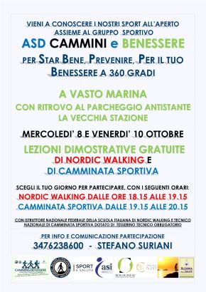 Vasto. Lezioni dimostrative gratuite di Nordic Walking e Camminata Sportiva a Vasto Marina, mercoledì 8 e venerdì 10 ottobre, con l’ASD Cammini e Benessere. “Vieni a conoscere i nostri sport all’aperto, praticati in gruppo con istruttore qualificato, per star bene, prevenire, per il tuo benessere a 360 gradi” – è questo l’invito che Stefano Suriani, presidente del sodalizio ed istruttore delle due discipline sportive, rivolge a quanti desiderano coinvolgersi in attività sportive con numerosi benefici psicofisici e metabolici.
