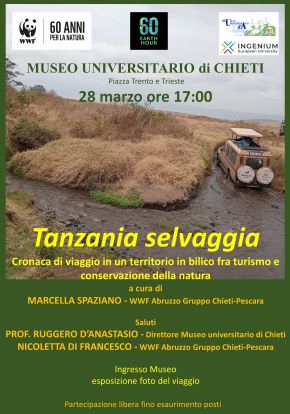 A Chieti alle 17, nell’auditorium del Museo universitario (ingresso da viale IV Novembre) Marcella Spaziano presenterà, con l’ausilio di belle immagini, riflessioni su “Tanzania selvaggia cronaca di viaggio in un territorio in bilico fra turismo e conservazione della natura”. Il racconto, nato da un recente viaggio, sarà accompagnato dall’esposizione (da martedì 24 marzo) nella sala d’ingresso del Museo di una selezione delle foto che Marcella ha scattato in Africa. L’ingresso è libero.