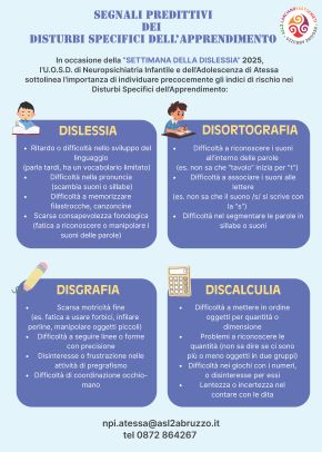 «Il nostro obiettivo è duplice – spiega Riccardo Alessandrelli, responsabile dell’unità operativa di Neuropsichiatria infantile e dell’adolescenza di Atessa – da un lato, supportare le famiglie e la scuola nel riconoscere i primissimi campanelli d’allarme, che possono manifestarsi già prima dell’inizio della scuola primaria con difficoltà nel linguaggio, nella memorizzazione di filastrocche o nella coordinazione motoria. Dall’altro, fornire una presa in carico completa e multidisciplinare che, attraverso una diagnosi accurata, permetta di definire un progetto su misura per ogni studente, come previsto dalla legge 170 del 2010».
