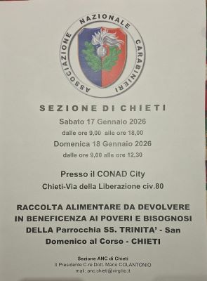 Questa settimana è stata organizzata la raccolta di beneficenza per Sabato 17 gennaio , dalle ore 9,00 alle alle ore 18,00 e Domenica 18,dalle 9,00 alle 12,30 presso il CONAD City in Via della Liberazione civ.80 a Chieti con pieno accoglimento della gestione della struttura commerciale ,dove volontari dell’ANC e delle Benemerite in divisa sociale, raccoglieranno le donazioni alimentari che i cittadini vorranno generosamente offrire.