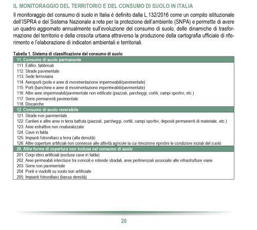 Forniamo a supporto la tabella delle categorie usate da ISPRA per calcolare il consumo di suolo, tratta dall’ultimo rapporto edizione 2025.