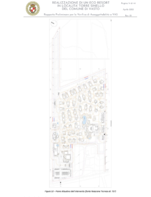 Lungo la “Via Verde” a Vasto, tra la Riserva di Punta Aderci e strada Torre Sinello, è in arrivo un “resort” composto da ben “_52 unità di alloggi prefabbricati_” (cosiddette unità abitative mobili) ciascuna delle quali sarà caratterizzata, si legge nel progetto, da un parcheggio per un’auto e da “_un deck esterno in legno e policarbonato, da piscine e da area giardino di pertinenza_”. Un intervento su quasi 4 ettari di terreni, in quello che molti anni or sono era un camping e che oggi è un’area coperta quasi integralmente da vigne, incolti e alberi. Ai pochi edifici esistenti sarà aggiunta un’area wellness. Una parte del lotto interessato dal progetto ricade nell’area protetta.