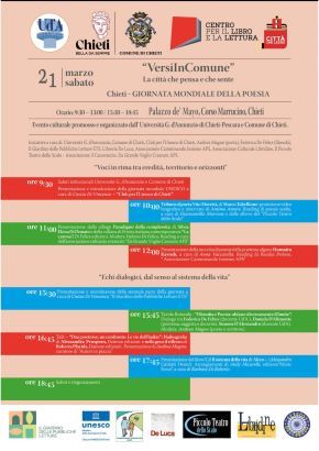Chieti. In occasione della Giornata Mondiale della Poesia, sabato 21 marzo 2026 Chieti ospiterà l’iniziativa “VersiInComune – La città che pensa e che sente”, una giornata interamente dedicata alla poesia, alla riflessione culturale e al dialogo tra linguaggi artistici e discipline del pensiero. L’evento si svolgerà a Palazzo de’ Mayo, sul Corso Marrucino, con attività previste dalle 9.30 alle 13.00 e nel pomeriggio dalle 15.30 alle 18.45.