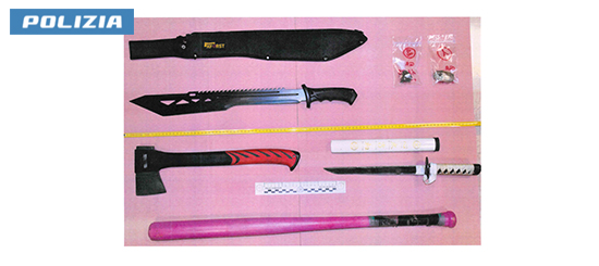 Le perquisizioni delegate hanno portato al rinvenimento di numerose armi improprie, tra cui un machete e una katana, oltre a una modica quantità di sostanze stupefacenti. Per il rinvenimento di hashish per un peso complessivo di 31 grammi si è proceduto con separata contestazione.
