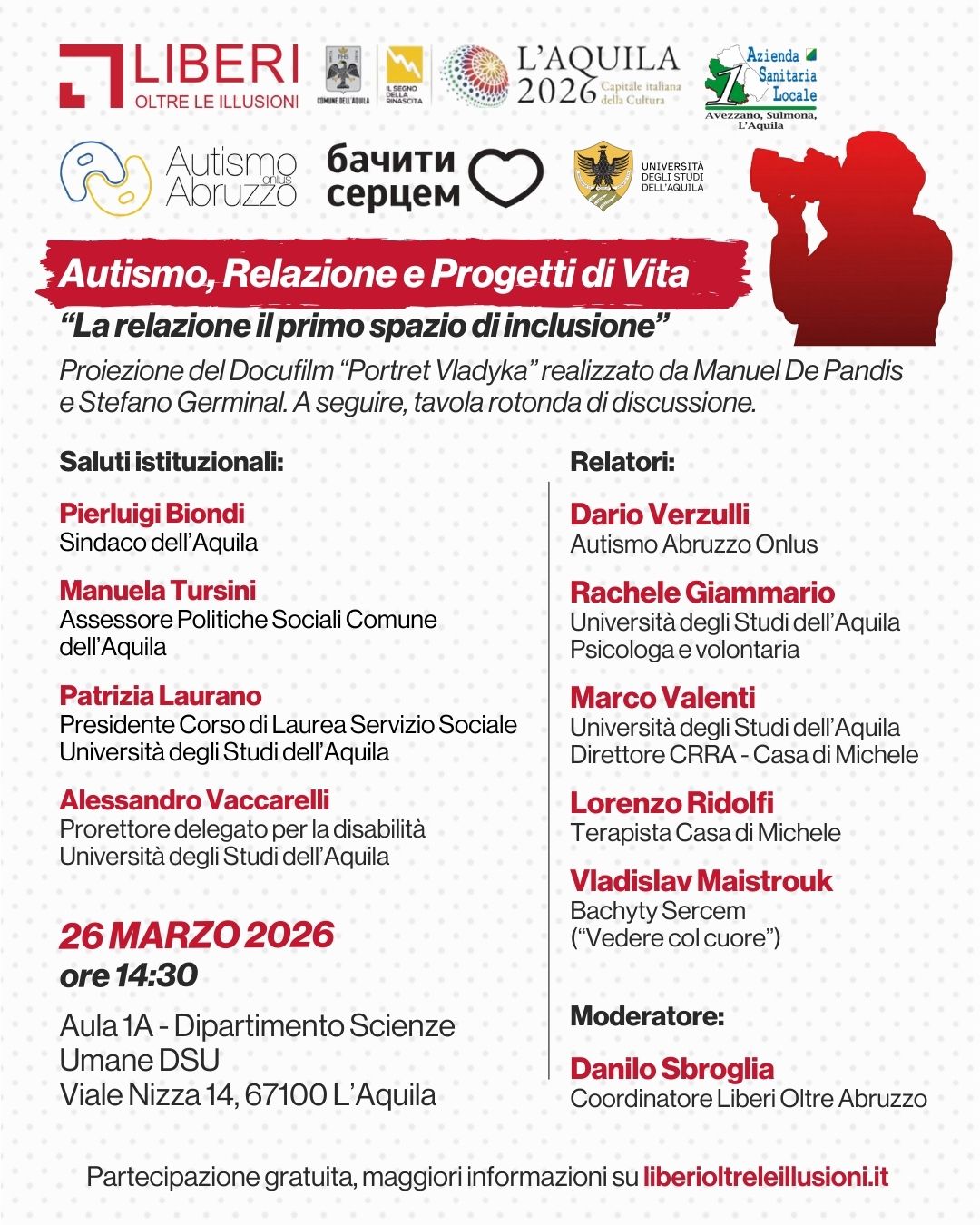 L’Aquila. Il prossimo 26 marzo 2026 ore 14:30, nell’Aula 1A del Dipartimento di Scienze Umane dell’Università degli Studi dell’Aquila, si svolgerà un’incontro voluto ed organizzato dalle associazioni Autismo Abruzzo e Liberi Oltre le Illusioni per parlare di autismo.