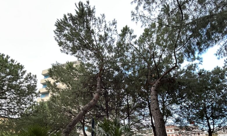 Due Pini si erano pericolosamente inclinati – appoggiandosi uno sull’altro – sulla sede stradale, sollevando i cordoli, per cui si è resa indispensabile la rimozione urgente, mentre i due Pini erano sospesi sulle chiome degli alberi situati sul lato opposto della strada.