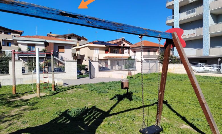 Montesilvano. “Un profondo senso di incuria, trascuratezza e di abbandono. I pochi giochi presenti sono tutti abbastanza datati, e un’altalena in legno con una trave visibilmente ammalorata che, potrebbe cedere da un momento all’altro”.