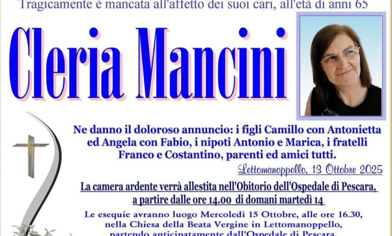 Il sindaco Simone Romano D’Alfonso, “in segno di profondo cordoglio e partecipazione al dolore che ha colpito la famiglia Mancini e l’intera comunità di Lettomanoppello per la tragica scomparsa della cara Cleria Mancini, considerato il profondo sentimento di commozione e vicinanza espresso dalla cittadinanza, ritenuto doveroso interpretare e rappresentare i sentimenti dell’intera popolazione”, ha proclamato, con un’apposita ordinanza, il lutto cittadino per la giornata di domani, in concomitanza con il funerale della donna.