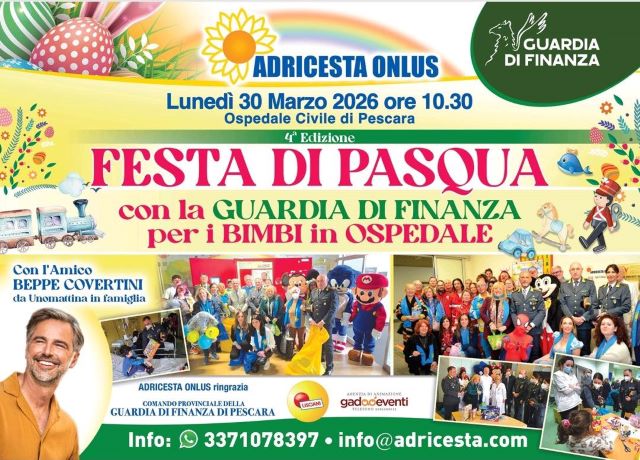 Pescara. Torna la tradizionale Festa di Pasqua ADRICESTA per i Bambini in Ospedale, giunta alla quarta edizione e realizzata con la partecipazione del Comando Provinciale della Guardia di Finanza di Pescara, impegnato anche nella raccolta fondi a sostegno dei progetti dell’associazione.