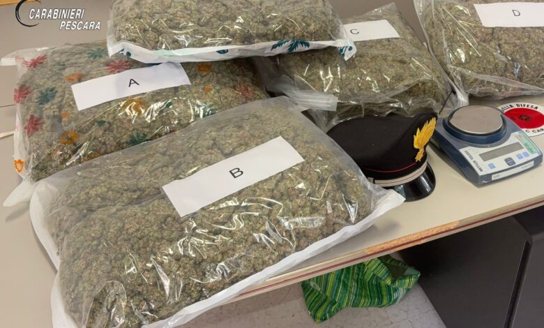 L’uomo, incensurato e di nazionalità italiana, incensurato, da qualche tempo era attenzionato dai militari, a seguito di numerose segnalazioni per una persona che faceva la spola tra Montesilvano e Pescara. L’uomo si aggirava nei pressi della sua abitazione con fare sospetto e guardingo, come se aspettasse qualcuno, con un grosso sacco nero tipo quelli utilizzati per la spazzatura. Gli operanti hanno deciso di intervenire per una perquisizione anche all’interno dell’abitazione del 44enne, rinvenendo 9,8 chilogrammi di marijuana, suddivisa in cinque buste sottovuoto pronte per la conservazione e, con ogni probabilità, per la successiva immissione sul mercato locale.