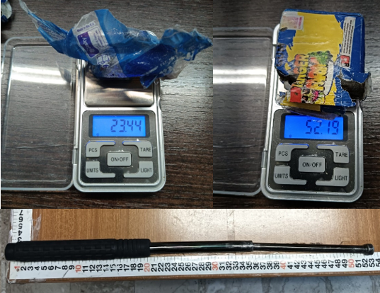 A seguito di perquisizione personale lo stesso veniva trovato in possesso, occultati nelle tasche interne del giubbotto due involucri in cellophane al cui interno vi erano circa 80 grammi di sostanza stupefacente tipo hashish nonché di un manganello telescopico che venivano sequestrati.