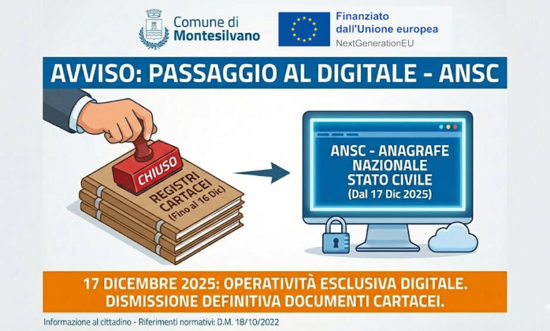 Montesilvano. Il Comune di Montesilvano annuncia un passaggio storico e irreversibile verso la completa digitalizzazione dei Servizi Demografici. Mercoledì 17 dicembre 2025 segnerà lo spartiacque definitivo tra l’amministrazione analogica e la nuova era digitale con la chiusura ufficiale e definitiva dei registri cartacei di stato civile e l’attivazione in esclusiva dell’ANSC (Anagrafe Nazionale dello Stato Civile).