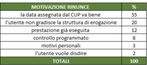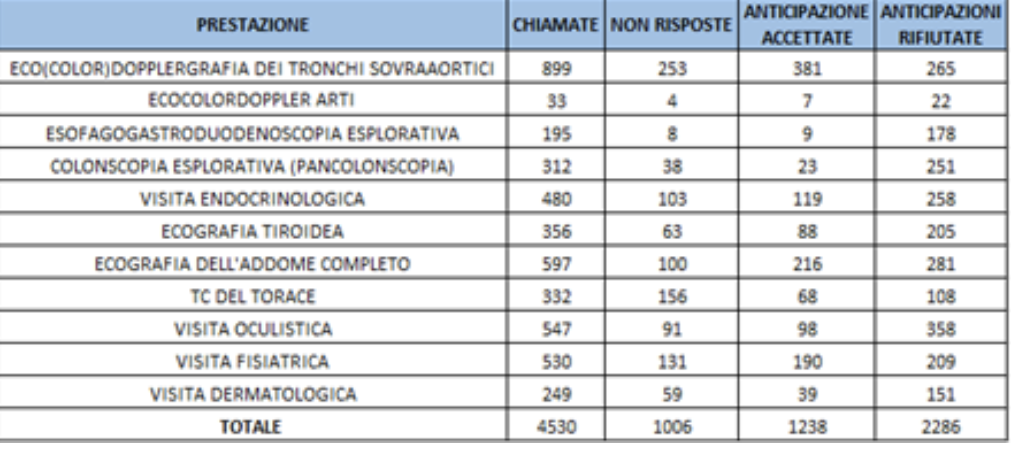 La tabella sopra esposta evidenzia che su 3.524 risposte, circa il 65% degli utenti contattati e che avevano prenotazioni “lunghe”, cioè fuori termine, ha rinunciato all’anticipazione della prestazione. Nel dettaglio il 95% degli utenti ha rinunciato all’anticipazione della gastroscopia, il 91% circa della colonscopia, il 79% circa della visita dermatologica, il 78% della visita oculistica. Inoltre per gli ecocolordoppler delle carotidi e degli arti inferiori il 42% circa ha rinunciato all’anticipazione.
