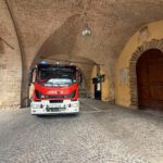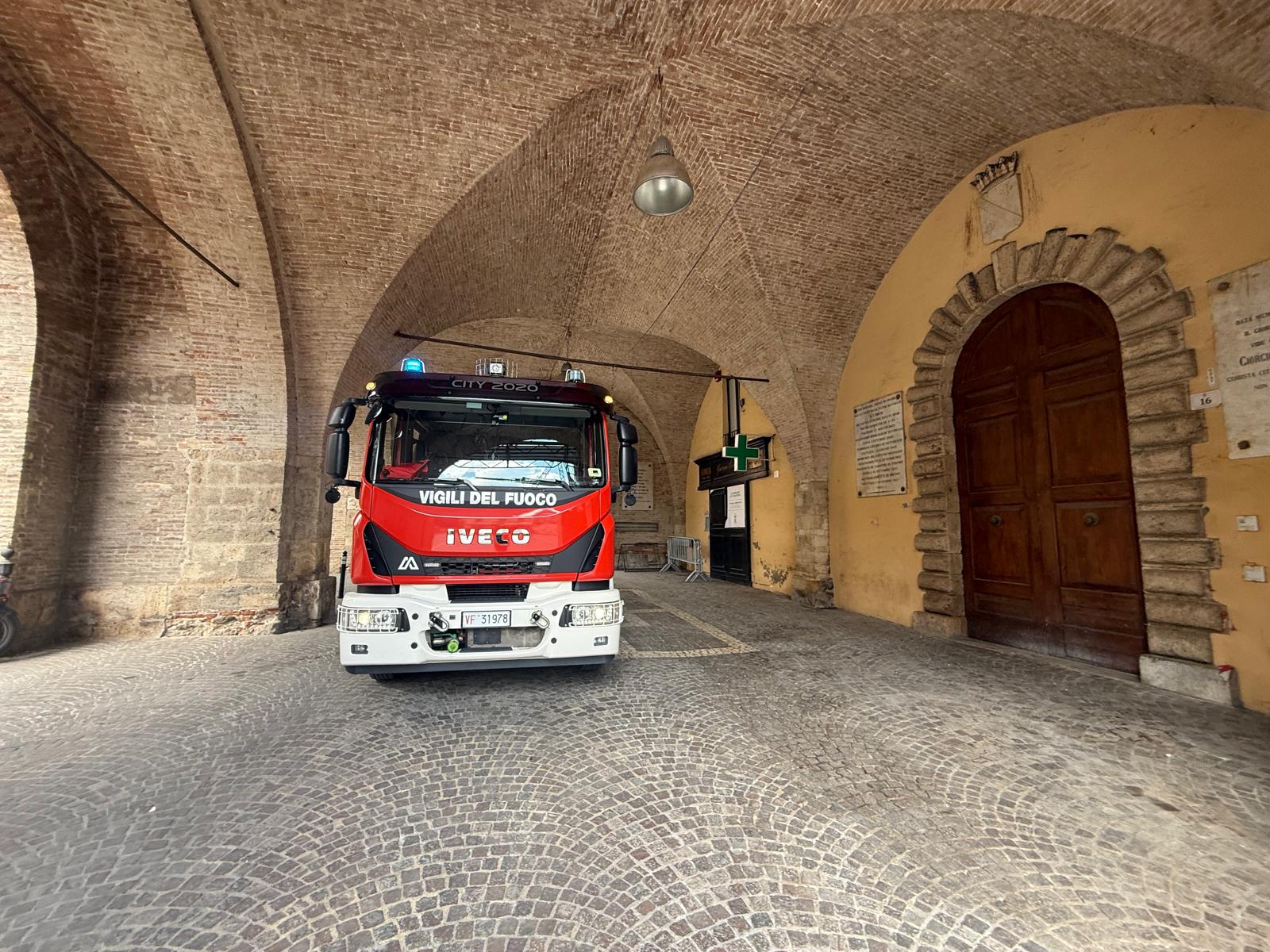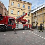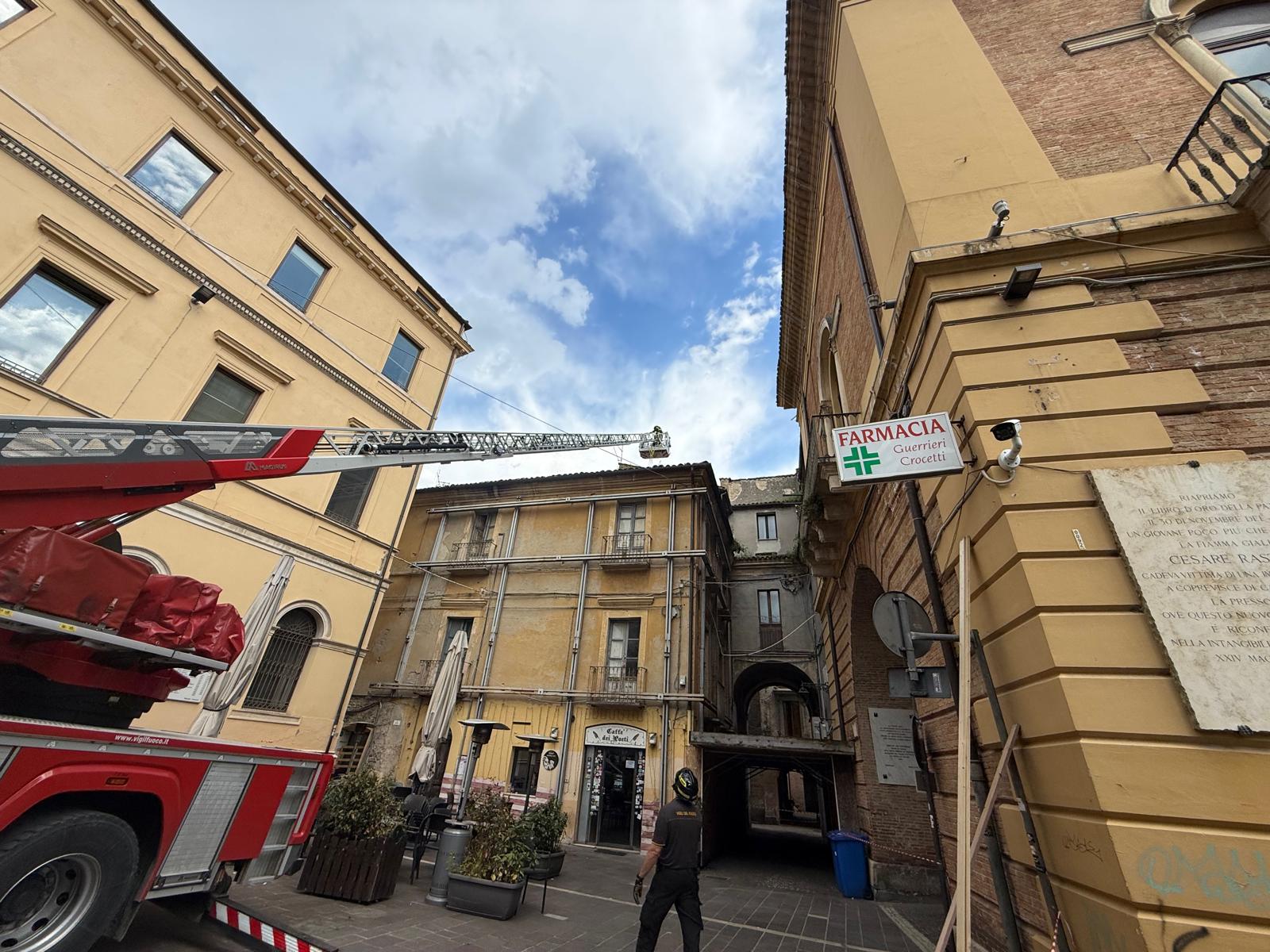 I vigili del fuoco hanno raggiunto il tetto dell’edificio con l’autoscala per posizionare un telo impermeabile sulla porzione della copertura interessata dal crollo, in modo da limitare le infiltrazioni di acqua piovana.