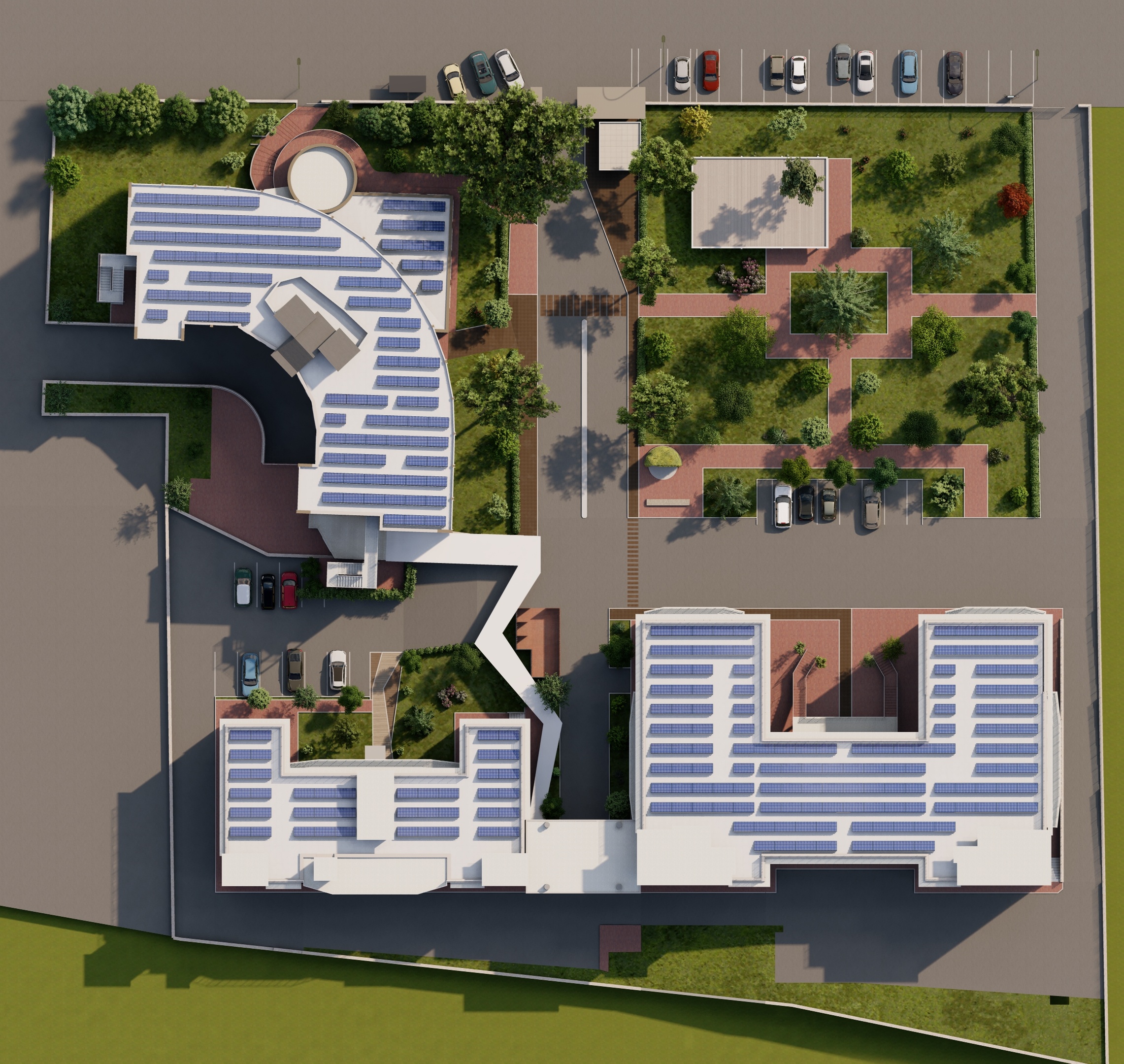 La ditta Coccia realizzerà: lastrico solare di impianto fotovoltaico per 180 KW; impianto di riscaldamento e raffreddamento a pavimento radiante a bassa inerzia termica alimentato a pompa di calore elettrica; posizionamento del cappotto esterno con ammodernamento delle facciate e sostituzione delle attuali tende da sole con chiusure oscuranti elettriche; realizzazione di un nuovo gazebo; installazione di 2 colonnine per ricarica elettrica; percorsi dattili di vari colori per favorire sia l’ingresso ai vari edifici che il percorso per gli ipovedenti; rifacimento di tutti i passaggi pedonali; rifacimento dei balconi e dei parapetti esistenti; realizzazione di percorso coperto per collegare i tre edifici; ventilazione meccanica controllata con recupero di calore (permette il ricambio continuo dell’aria interna senza dispersione del calore).