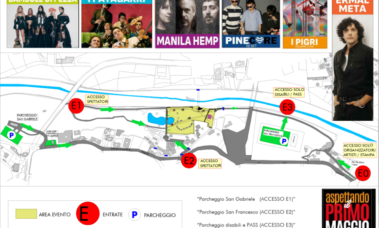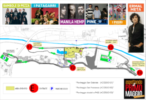 – Due i varchi di accesso che condurranno all’area del concerto: Scalinata del parcheggio San Gabriele (parcheggio consigliato San Gabriele); Discesa Vecchio Mattatoio – via delle Officine (parcheggio consigliato San Francesco);