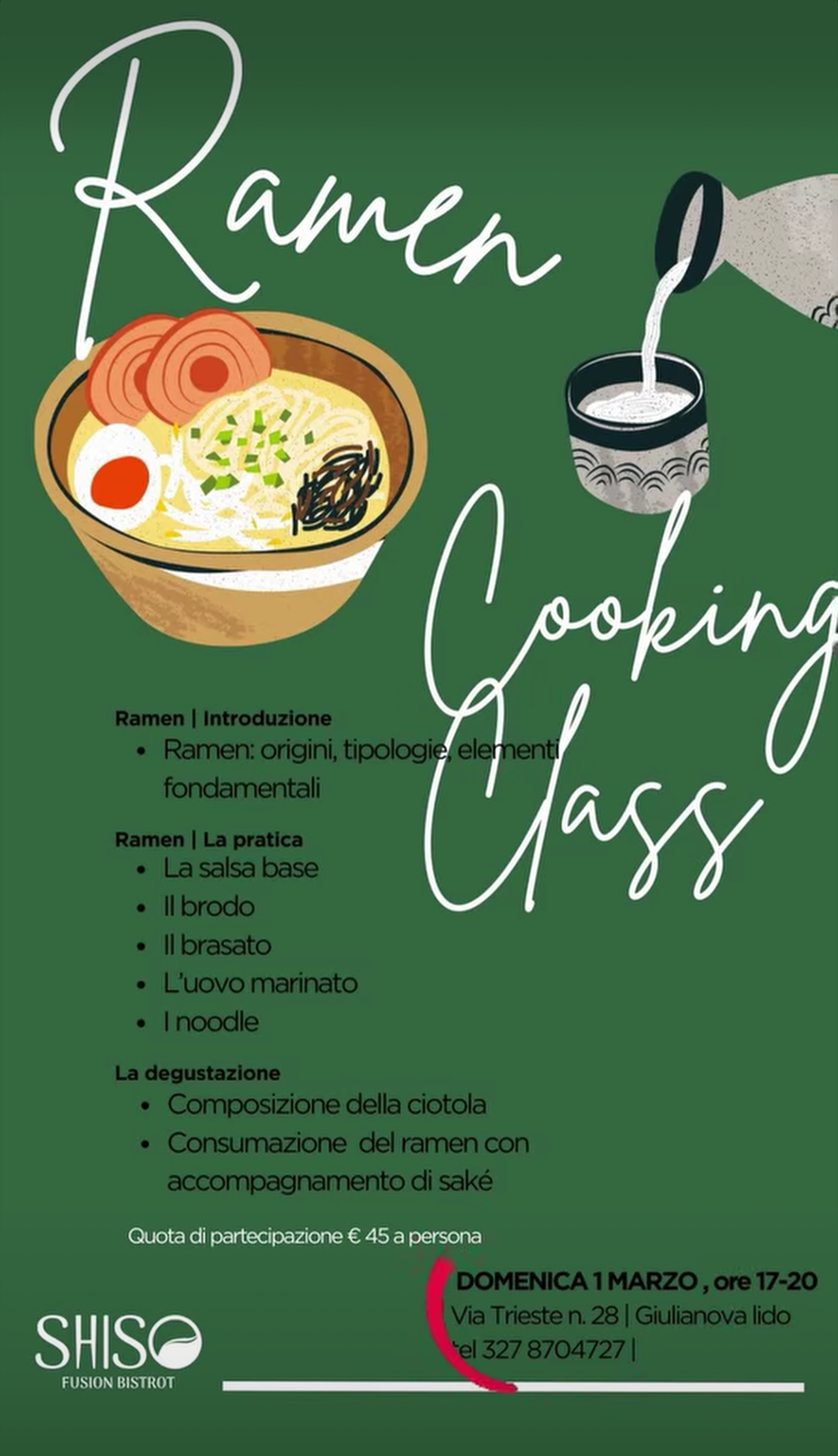 Un viaggio tra tradizione giapponese e tecnica culinaria: è questo lo spirito della Ramen Cooking Class organizzata da Shiso Fusion Bistrot, un appuntamento dedicato agli appassionati di cucina orientale e a chi desidera scoprire i segreti di uno dei piatti più iconici del Giappone.L’evento si terrà domenica 1 marzo, dalle ore 17 alle 20, nella sede di via Trieste 28 a Giulianova Lido. Un’esperienza formativa e sensoriale che accompagnerà i partecipanti alla scoperta del ramen, dalle origini fino alla composizione finale della ciotola.