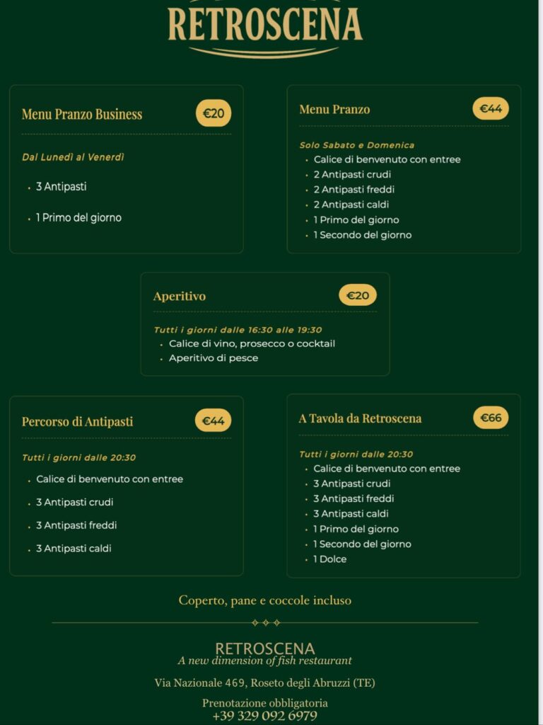 Il cuore pulsante di Retroscena è la sua cucina di pesce, declinata in più percorsi gastronomici che uniscono tradizione e creatività. Il tutto accompagnato da una location curata nei dettagli, dove ogni elemento è pensato per esaltare l’esperienza del cliente.
