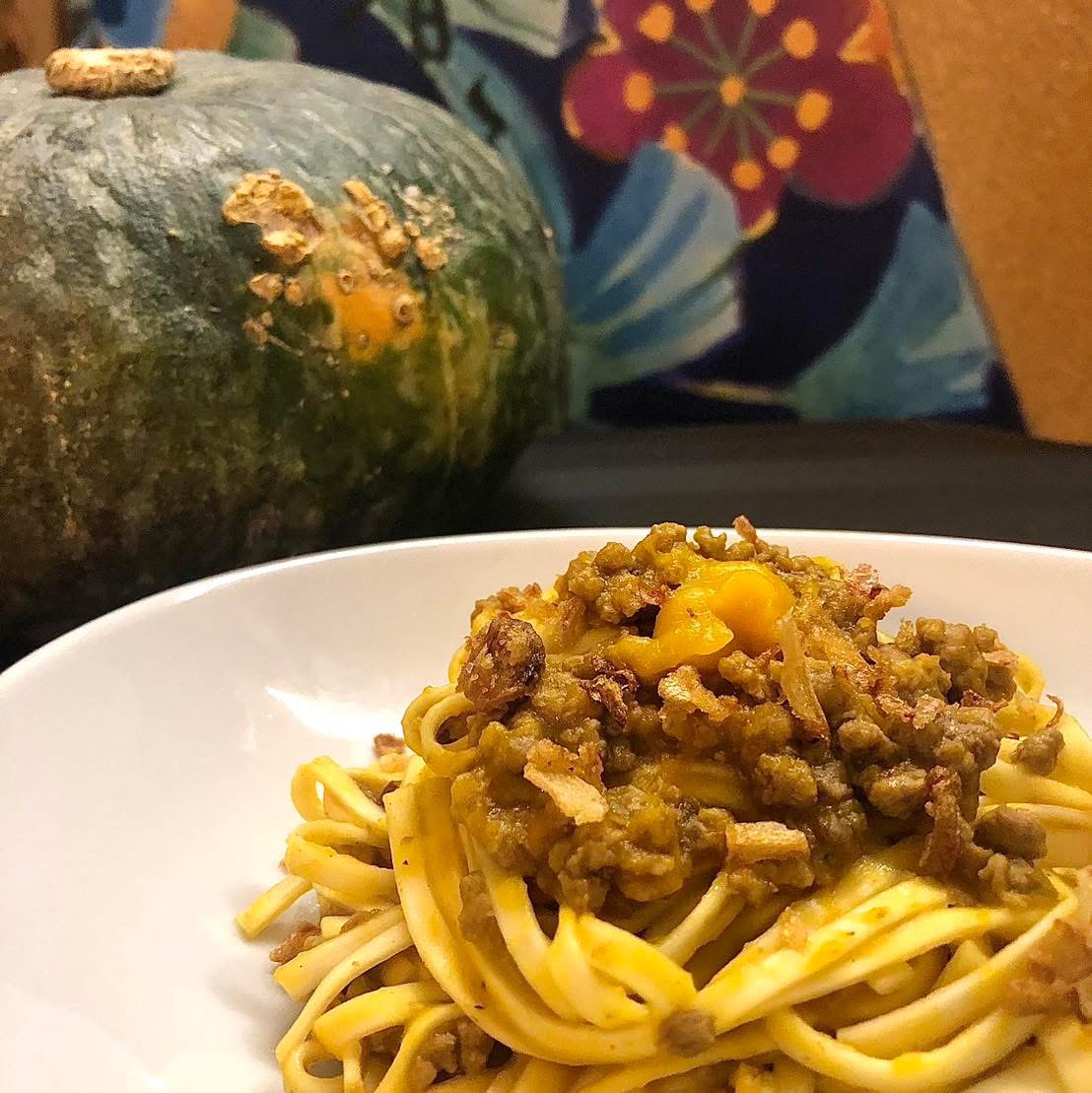 Udon con crema di zucca al miso e ragù di carne alla soia – un equilibrio perfetto tra dolcezza, sapidità e comfort food, che unisce sapori orientali e ingredienti stagionali in un mix raffinato e sorprendente.