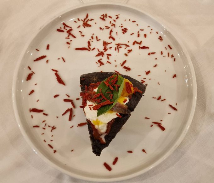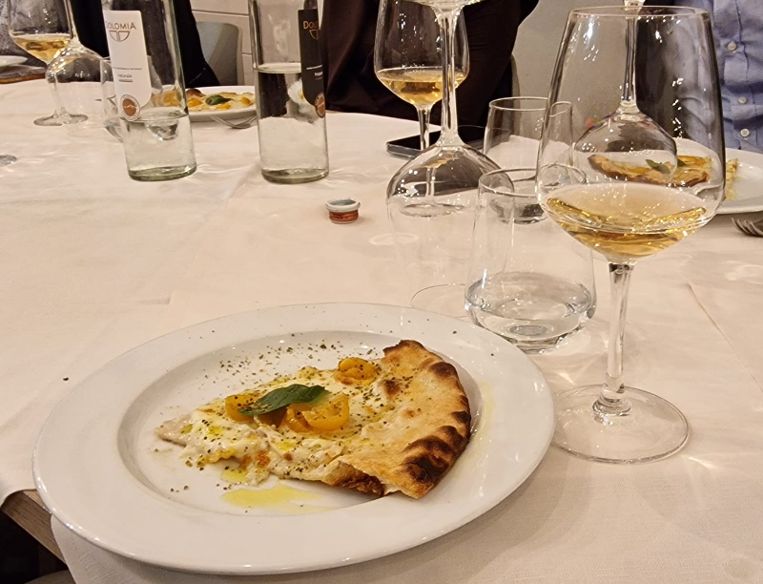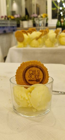 50 % di meunier (vitigno cardine dell’Ardre ma nutrito dal suolo gessoso di Reims) e dal restante 50% di pinot noir schietto e deciso; il vino subisce una fermentazione spontanea (si può fare quando si ha un acino con una buccia integra e ricca) di 10 mesi in fusti di rovere da 225 litri (e non da 105 come prassi) quindi viene dosato a soli 2 grammi per litro di zuccheri residui. Solamente 600 bottiglie al mondo in vendemmia 2022, una sessantina in Italia e 15 a Tortoreto di questo “bourgogne con le bollicine”. Il costo di 95 euro è giusto per un prodotto esclusivo. Dulcis in fundo gelato allo Yuzu e cocco per la “pulizia del palato”. Mi sono impegnato molto per organizzare questa degustazione in quanto la pizza è da troppi considerata come un “rimedio”, un’alternativa quando non si ha altro; per diventare una SCELTA dev’essere concepita e realizzata bene con materie prime di alta qualità e la pizzeria Santa Croce ha “incarnato” ciò!
