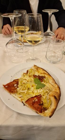 Il meunier delle vigne di Vandières (alta vallèe de la marne) costa 60 euro ed ha un vasto spettro d’abbinamento; infatti, l’abbiamo degustato anche con la prima pizza in scaletta, una BIANCA, POMODORINI GIALLI, BUFALA AFFUMICATA E PEPE AL LIMONE che consiglio vivamente d’ inserire in menù magari denominandola “LA BIANCA CHE NON T’ASPETTI”! Questa pizza è stata la rivelazione della serata! Arriva il momento della seconda pizza, una BIANCA CON CARCIOFI, GUANCIALE E GRANA che ha alzato l’asticella del sapore senza cadere nella stucchevolezza; un altro “centro” dello “ZIO” ! In abbinamento, uno chardonnay 100% di Foussy (zona ovest della marna) dosato a 6,5 grammi per litro e lavorato ben 5 anni sui lieviti. L’ancrages di Arnaud Robert, vigneron indepèndant, è uno champagne grasso ma “spigoloso” o “selvatico” rispetto al Lebrun; degustato senza abbinamento, stufa ma abbinato ad una pizza bianca “SAPORITA” e grassa è eccellente. 55 euro per averne una bottiglia!