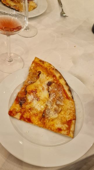 Voltiamo pagina passando a due pizze rosse di cui la prima è la versione Santa Croce della celeberrima margherita cioè con aggiunta di grana padano ed un po di pecorino in fase di cottura; è stato il TRIONFO DELLA SEMPLICITA’-COMPLESSA, un ossimoro che descrive in modo chiaro la pizza! In abbinamento uno champagne rose’ brut della vallèe de la marne (Epernay) con un bel 40% di pinot nero. L’Aubert & fils rosè è un “vecchio amico” già utilizzato nella serata “carni identitarie incontrano champagne artigianali” e si caratterizza per una vinosità marcata, aroma di frutti rossi, bollicina finissima ed una secchezza giusta. E’ lo champagne da tenere sempre in frigo in quanto abbinabile a tutto (ricordo una serata d’estate con un gelato ai frutti di bosco)! Costa 33 euro in enoteca! Ultima pizza della serata la famosa AMATRICIANA, un vero e proprio inno al “peccato consapevole”! Ricca, voluttuosa, saporita e dannatamente “tanta”! Per “lei” un partner d’eccezione, un rosè de saignèe artigianale proveniente dal LIEU DIT “LE MAHOMET”, particella catastale situata nel comune di Villers aux Noeuds, paesotto di 174 anime facente parte della zone frontalière tra la Montagne de Reims e la Vallèe de L’Ardre.