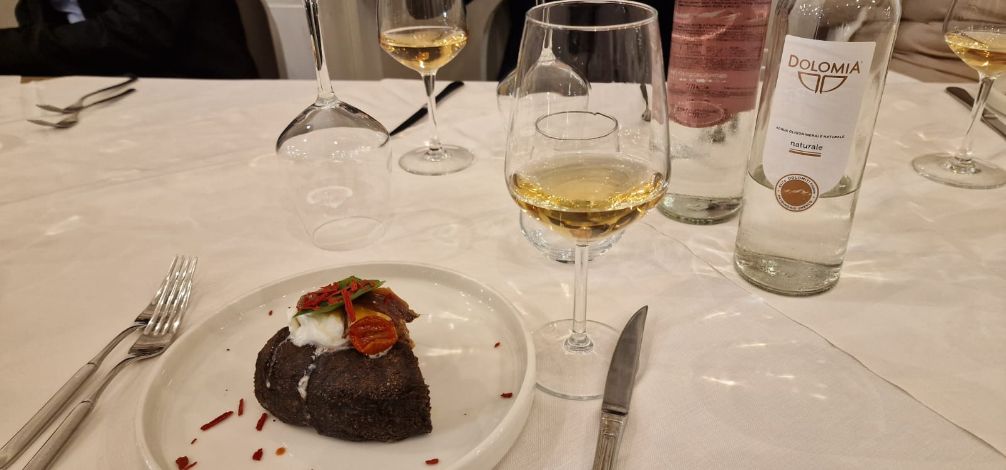 iniziando con una focaccia vecchio stile quindi alta e soffice; il PADELLINO CON POMODORINI GIALLI E ROSSI ED ALICI DEL CANTABRICO (consistenti e poco salate) si è presentato scuro provocando espressioni dubbiose nei degustatori pronti a lapidarmi pubblicamente ma, dopo l’assaggio, ho notato solamente occhi colmi di meraviglia ed approvazione. L’impasto è costituito da una farina al cacao frutto della collaborazione di zio Gianni e del nipote Gabriel, aperto al futuro il primo e “nato per l’innovazione” il secondo! In abbinamento ho scelto uno champagne dosato (quindi non eccessivamente secco) ed abbastanza lavorato sui lieviti; vinosità e grassezza sono requisiti fondamentali per l’abbinamento con pizze saporite e, se aggiungiamo “identità”, il gioco è fatto! Lo champagne bio brut (qualifica France bio 010) della maison Albert Lebrun (1860) è una vecchia conoscenza in quanto già usato nella tappa “la cucina canzanese incontra lo champagne” come arma per tenere testa alla saporita mazzarella al forno del ristorante La Tacchinella.