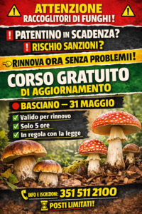 Il Circolo ARCI Ephedra APS di Basciano, in collaborazione con Nuova Amena APS e con il patrocinio del Comune di Basciano, organizza per domenica 31 maggio un corso gratuito di aggiornamento in micologia, valido per il rinnovo quinquennale dell’autorizzazione alla raccolta dei funghi epigei spontanei in Abruzzo.