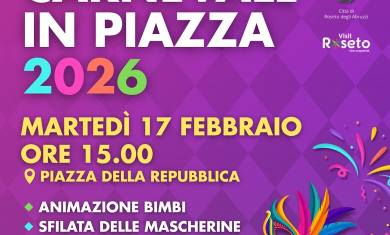 Il colore, l’allegria e la magia del Carnevale tornano ad animare Roseto degli Abruzzi. L’Amministrazione Comunale annuncia ufficialmente l’edizione 2026 di “Carnevale in Piazza”, che si terrà martedì 17 febbraio, a partire dalle ore 15.00, nella cornice di Piazza della Repubblica.