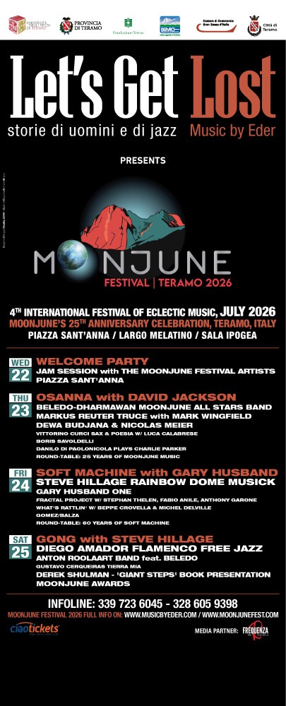 Dopo tre edizioni (Jaice 2022, Toledo 2023, Guadamur 2024), il label festival si trasferisce in Italia grazie all’Associazione Culturale Music By Eder guidata da Emiliano Di Serafino, una realtà attivissima da anni sul territorio teramano con tanti concerti apprezzati da pubblico e critica. Dal 22 al 25 luglio 2026 Teramo diventerà una vera e propria cittadella della musica ma anche un luogo di incontro e di scambio anche un il pubblico straniero, che segue da tempo gli eventi MoonJune. Concerti con un cast internazionale, tavole rotonde, percorsi esperienziali e conoscitivi del territorio di carattere enogastronomico, naturalistico e storico-culturale anche grazie alla collaborazione delle istituzioni (Università degli Studi di Teramo, Città di Teramo, Provincia di Teramo, Fondazione Tercas, B.I.M Vomano e Tordino, Camera di Commercio del Gran Sasso d’Italia).