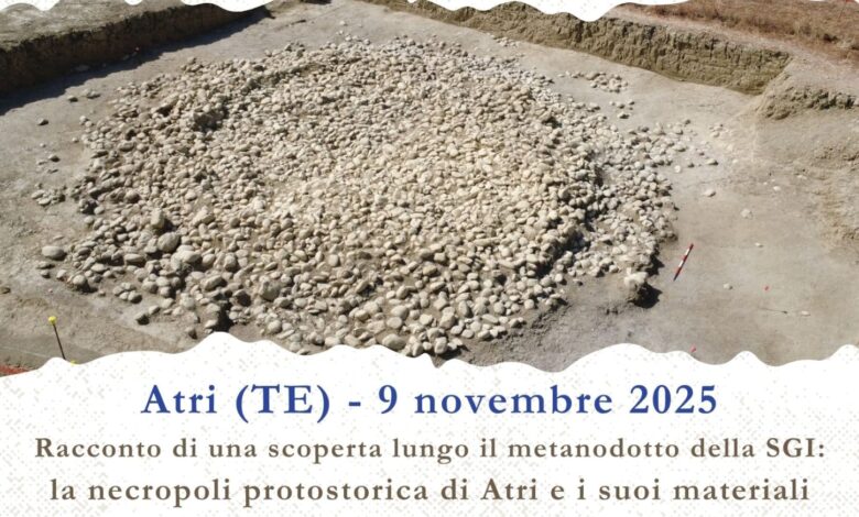 Si terrà domenica 9 novembre alle ore 17.00 ad Atri, nell’Auditorium della Chiesa di Sant’Agostino, in Corso Elio Adriano, la conferenza dal titolo “Racconto di una scoperta lungo il metanodotto della SGI: la necropoli protostorica di Atri e i suoi materiali”.