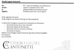 “Ebbene, considerato che all’inizio del mese di settembre scorso abbiamo assistito all’ apertura di alcune scuole comunali ristrutturate parzialmente, il giorno mercoledì 23 settembre nella mia qualità di consigliere comunale e per mero scrupolo ho inoltrato a mezzo pec al Segretario Generale, al Dirigente del Settore e al Rup competente una formale richiesta di accesso agli atti in via d’urgenza che allego, per ottenere una copia del certificato di agibilità delle seguenti Scuole: – Scuola Fornaci Cona “Luca Tancredi”; Scuola Infanzia di Villa Vomano; Scuola Infanzia “La Casetta sul fiume; Scuola De Jacobis”.