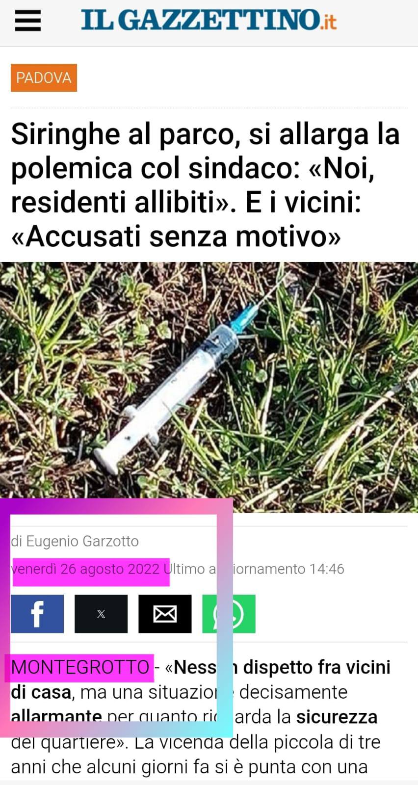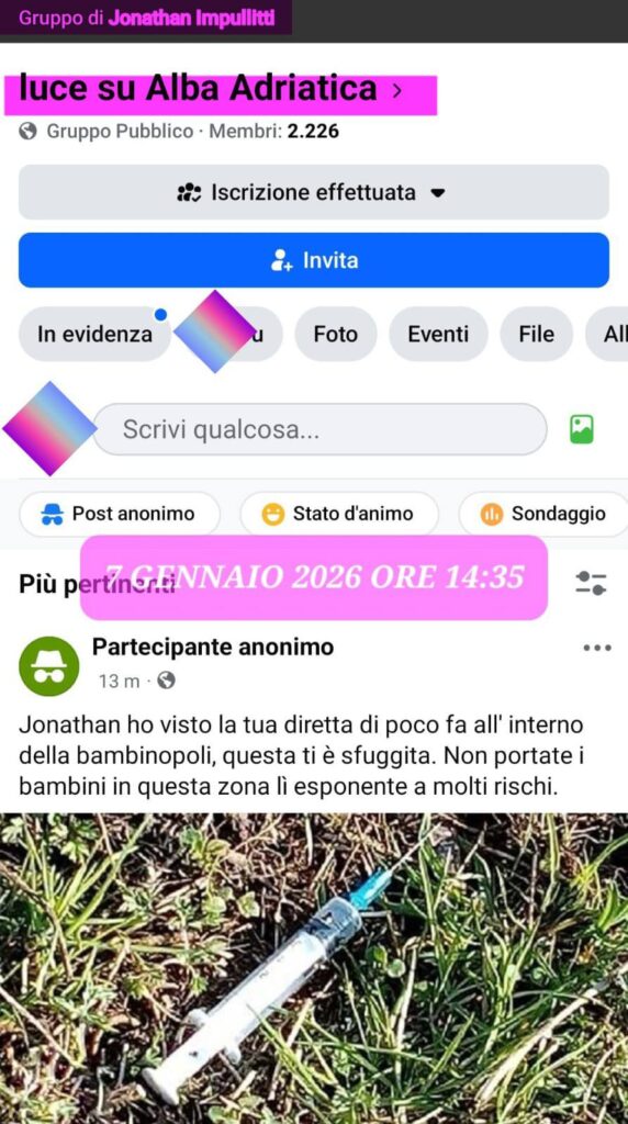 Alba Adriatica. Propaganda diffamatoria e falsificazione di immagini. Non è tenera l’amministrazione comunale di Alba Adriatica, guidata dalla sindaca Antonietta Casciotti, che denuncia pubblicamente la diffusione di immagini “false” raffiguranti siringhe abbandonate in un parco giochi comunale, pubblicate su un gruppo Facebook (Luce su Alba Adriatica”.
