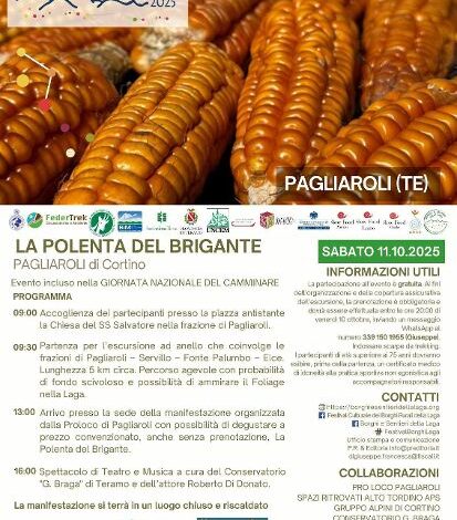 Sabato 11 si inizierà a Pagliaroli di Cortino, con un itinerario escursionistico guidato ad anello che collega le frazioni rurali di Servillo, Fonte Palumbo ed Elce, lungo gli spettacolari pianori erbosi del versante orientale della Laga, autentici terrazzamenti naturali da cui è possibile ammirare un panorama di eccezionale bellezza che spazia dal Mare Adriatico al Gran Sasso d’Italia, reso ancor più suggestivo in coincidenza dell’inizio del periodo del “foliage”. Al rientro, oltre ad un spettacolo di musica e teatro a cura del Conservatorio G.Braga previsto nel pomeriggio, ci sarà la possibilità di gustare in un luogo chiuso e riscaldato la deliziosa “Polenta del Brigante”, un piatto tradizionale tanto caro al Re Vittorio Emanuele II, riproposto grazie ad un interessante progetto di recupero e valorizzazione della biodiversità avviato dalla locale Proloco di Pagliaroli, dopo il ritrovamento di alcuni semi di mais “ottofile” in un cassetto di una antica casa rurale. L’intrattenimento musicale rievoca la tradizione popolare tra le note di organetto, fisarmonica, zampogna e ciaramella.