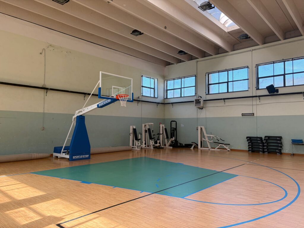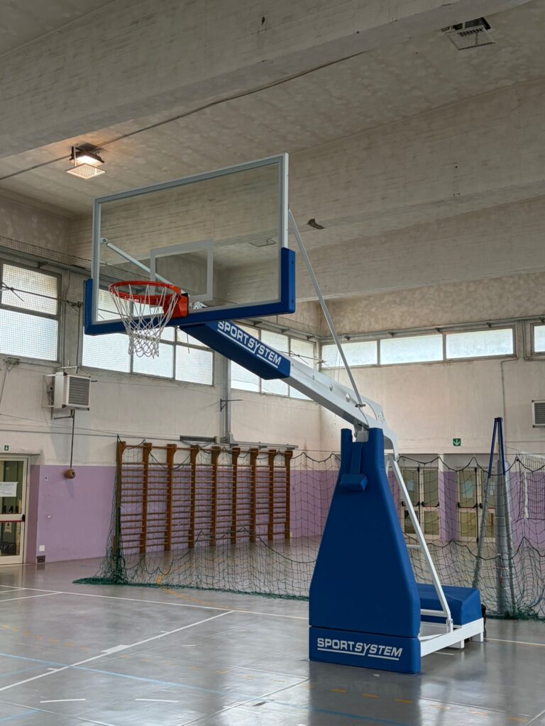 I.T.I.S. “Alessandrini“. Interventi all’interno della palestra scolastica: sostituzione dei canestri esistenti con modelli oleodinamici mobili che garantiscono conformità normativa e omologazione per l’uso sportivo.