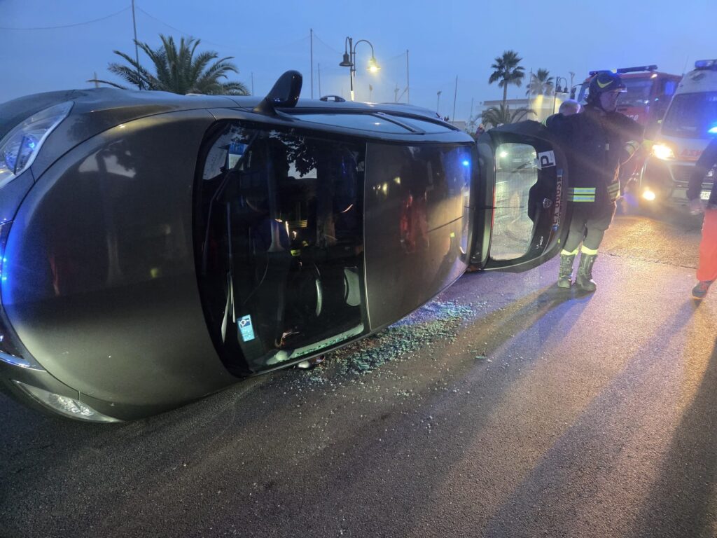 La Lancia Y si è ribaltata su di un lato dopo aver toccato una panda in sosta sulla riviera.