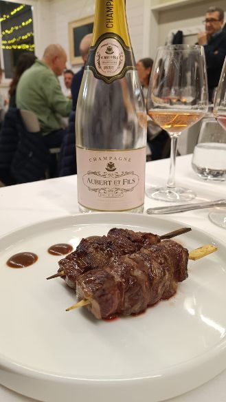 Il costo di 33 euro in enoteca, parla da solo! E’ distribuito in Italia da Premium Wine Selection. La seconda tipologia di carne propostaci da Gabriel è stata un ANGUS SPAGNOLO di alta qualità con un gusto intenso profondamente diverso da quello della manzetta. Questa eccellenza galiziana ci è stata proposta a mò di succulenti bocconi in spiedone: i RIB FINGERS di Miguel Vergara! Resomi conto dell’impatto di sapore della carne, ho proposto un abbinamento per dissonanza “canonico” con vinosità importante, secchezza e sapidità media ed un altro con una “dissonanza-assonanza” cioè una vinosità meno marcata ma secchezza e sapidità maggiore. Il rose’ de saignèe (salasso in italiano) 100% pinot noir extra brut (3 g./litro) millesimato 2018 premier cru di William Saintot (vigneron independant) con sede ad Avenay (val d’or, al confine orientale della vallèe de la marne con la montagne de reims) è innanzitutto un gran vino rosso con un pò di bollicine!