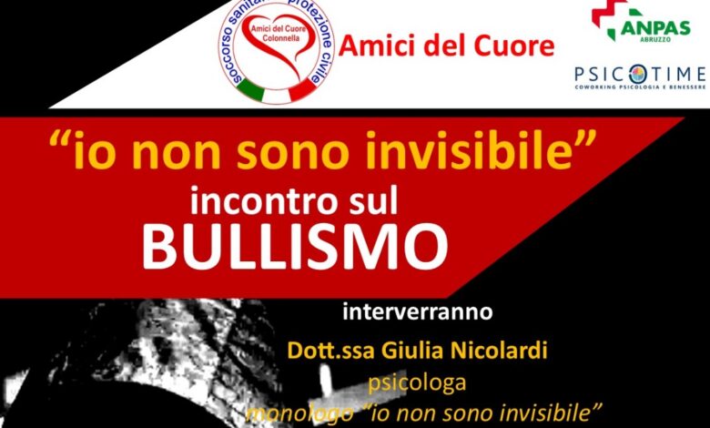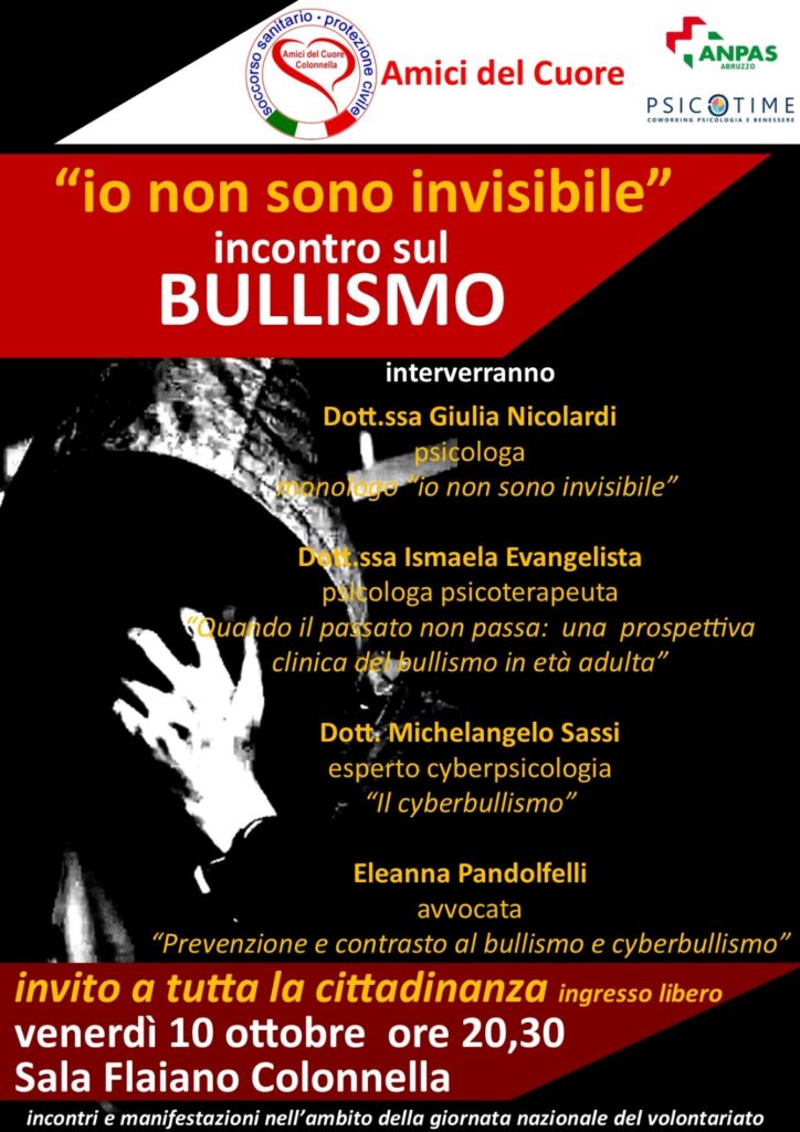 Si parte venerdì 10 ottobre (ore 20.30 in Sala Flaiano) con l’iniziativa “Io non sono invisibile”: incontro sul bullismo. Diversi i relatori presenti per analizzare, nel dettaglio, sotto vari aspetti. Interverranno: Giulianova Nicolardi (psicologa), Ismaela Evangelista (psicologa-psicoterapeuta), Michelangelo Sassi (esperto in cyberpsicologia), Eleanna Pandofelli (avvocata).