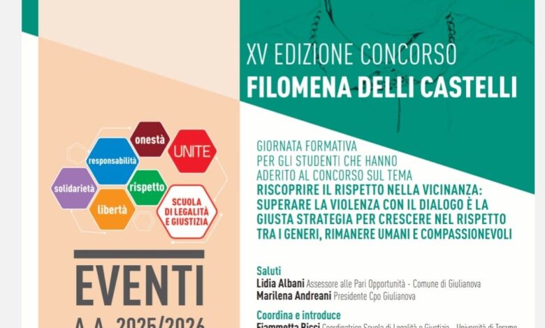 Giulianova. Si terrà domani, 24 febbraio, dalle 9:30 alle 12:30, la Giornata formativa rivolta agli studenti che hanno aderito alla XV Edizione del Concorso “Filomena Delli Castelli”.