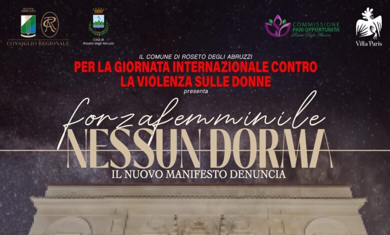 Roseto. La Città di Roseto degli Abruzzi, su proposta della Consigliera Comunale con delega alle Pari Opportunità Toriella Iezzi, e in collaborazione con l’associazione A.P.S. Forza Femminile e la CPO di Roseto, presenta l’evento “Nessun Dorma, un nuovo manifesto di denuncia”, una manifestazione di sensibilizzazione in vista della Giornata Internazionale contro la Violenza sulle Donne.