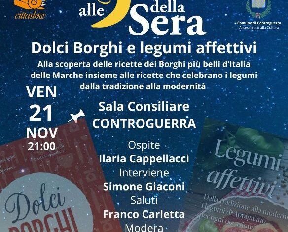 Ospite della serata sarà Ilaria Cappellacci, autrice dei volumi “Dolci Borghi. Le ricette dei Borghi più belli d’Italia nelle Marche” e “Legumi Affettivi. Ricette dalla tradizione alla modernità”, che dialogherà con l’assessore alla cultura Fabrizio Di Bonaventura.