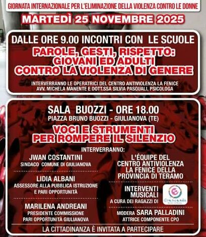 Giulianova. Il 25 Novembre è una data significativa, fondamentale per evidenziare un fenomeno che, lo conferma la cronaca, non si arresta. Nella Giornata internazionale per l’eliminazione della violenza contro le donne, che cade appunto il 25 Novembre, l’ Assessorato e la Commissione alle Pari Opportunità hanno organizzato, non a caso, iniziative ed eventi di sensibilizzazione e prevenzione.