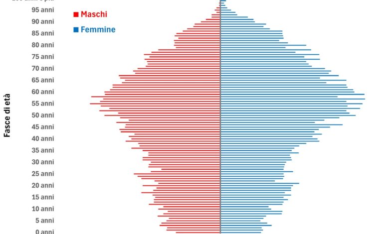 Infine, il confronto tra i dati del 2025 e quelli del 2019 mostra una tendenza chiara: in sette anni, l’età media è cresciuta di 1,3 anni, passando da 46,2 a 47,5 anni. La fascia dei più giovani (0–17 anni) è diminuita dal 14,5% al 13,9%, così come la fascia 18–64 anni, scesa dal 61,4% al 60,1%, mentre gli over 65 sono aumentati