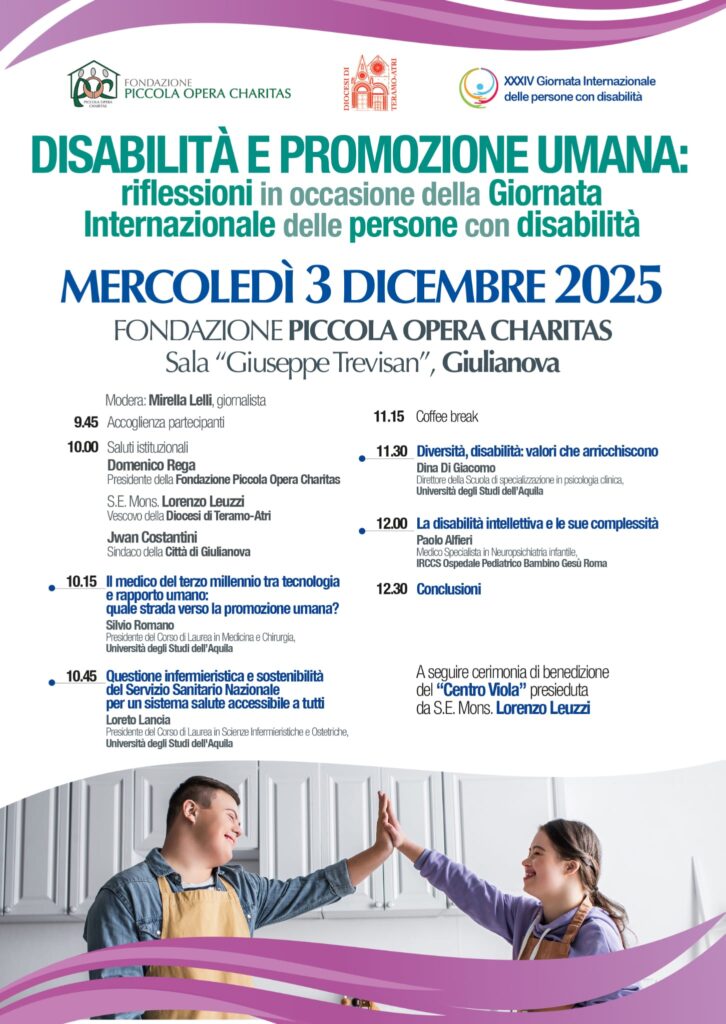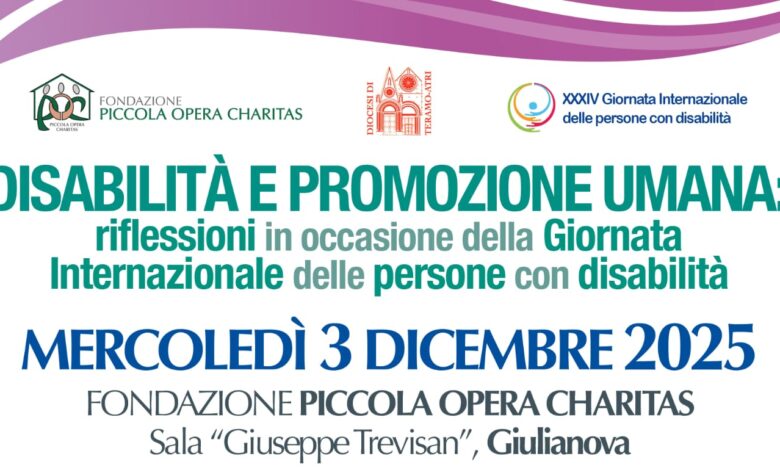 Giulianova. In occasione della XXXIV Giornata Internazionale delle Persone con Disabilità, la Fondazione Piccola Opera Charitas di Giulianova organizza un momento di riflessione e dibattito sul tema della promozione umana come obiettivo d’impegno personale e comunitario a favore di ciascuno e di noi tutti.