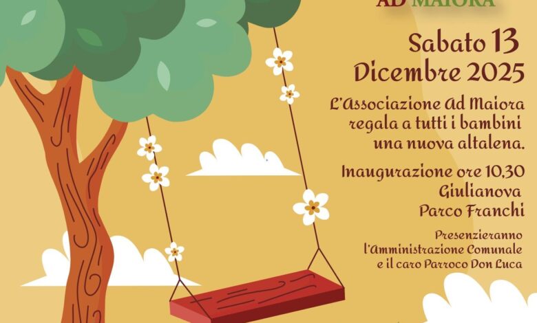 dell’infanzia. A tal proposito si fa presente che con il ricavato della cena di presentazione di ” Ad Maiora “è stato possibile donare alla città di Giulianova un’altalena per migliorare l’area giochi esistente presso il Parco Franchi. L’inaugurazione ci sarà sabato 13 dicembre alle ore 10.30. L’associazione Ad Maiora, nata soltanto a maggio scorso, già conta 230 soci, un numero importate grazie al quale potrà contribuire ad offrire un aiuto a chi ne ha particolarmente